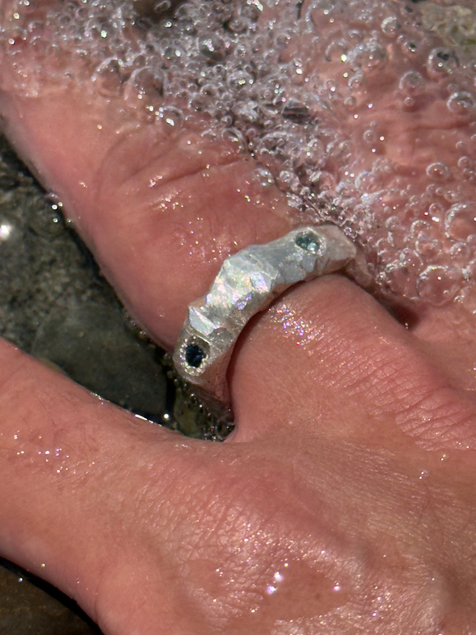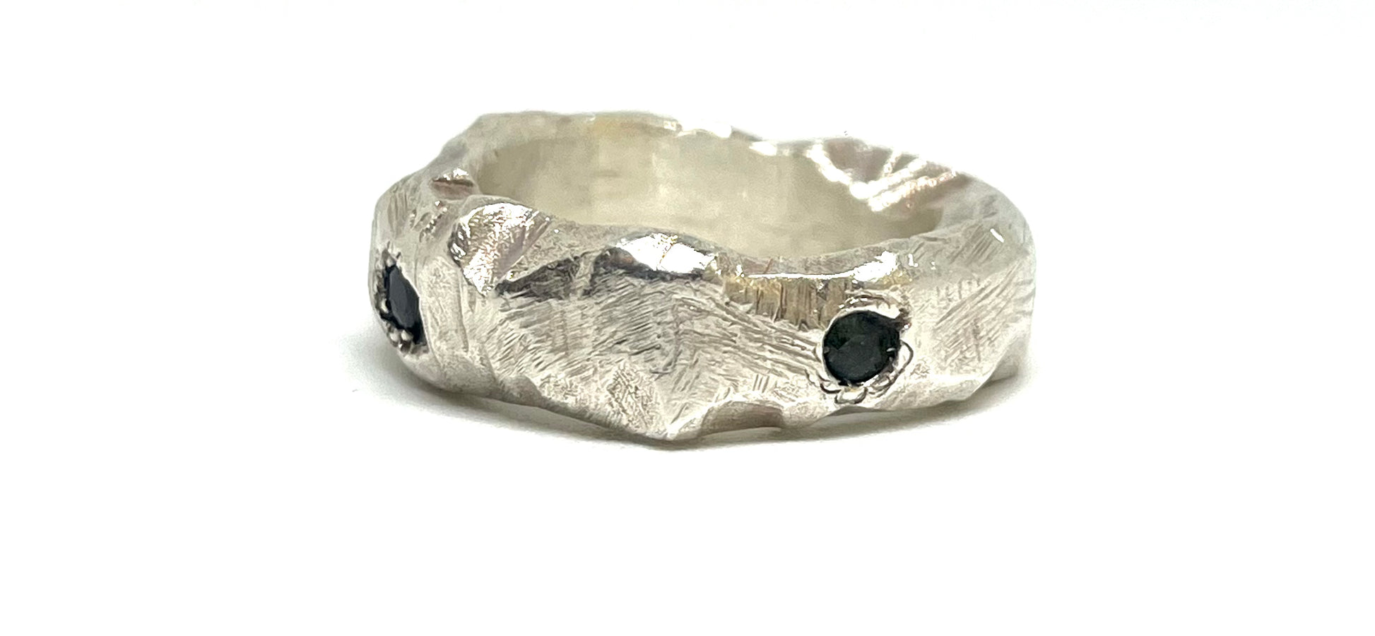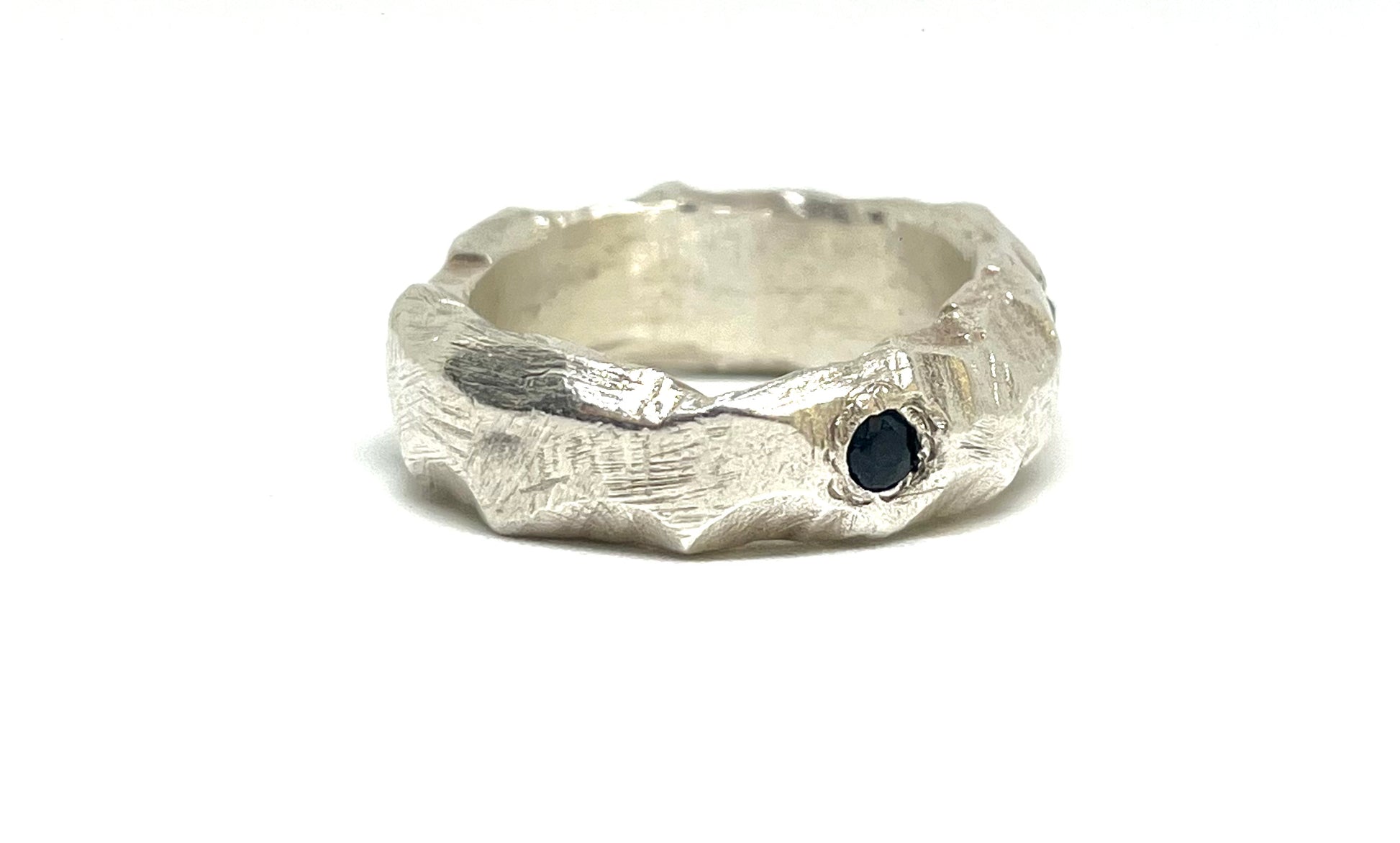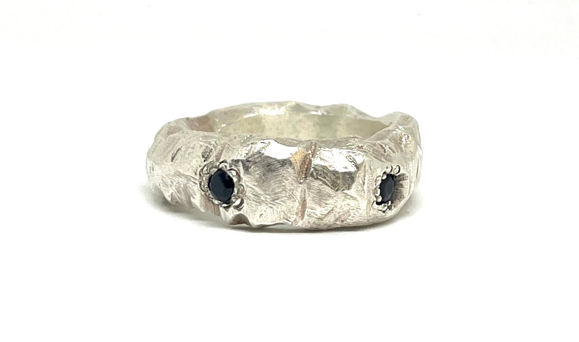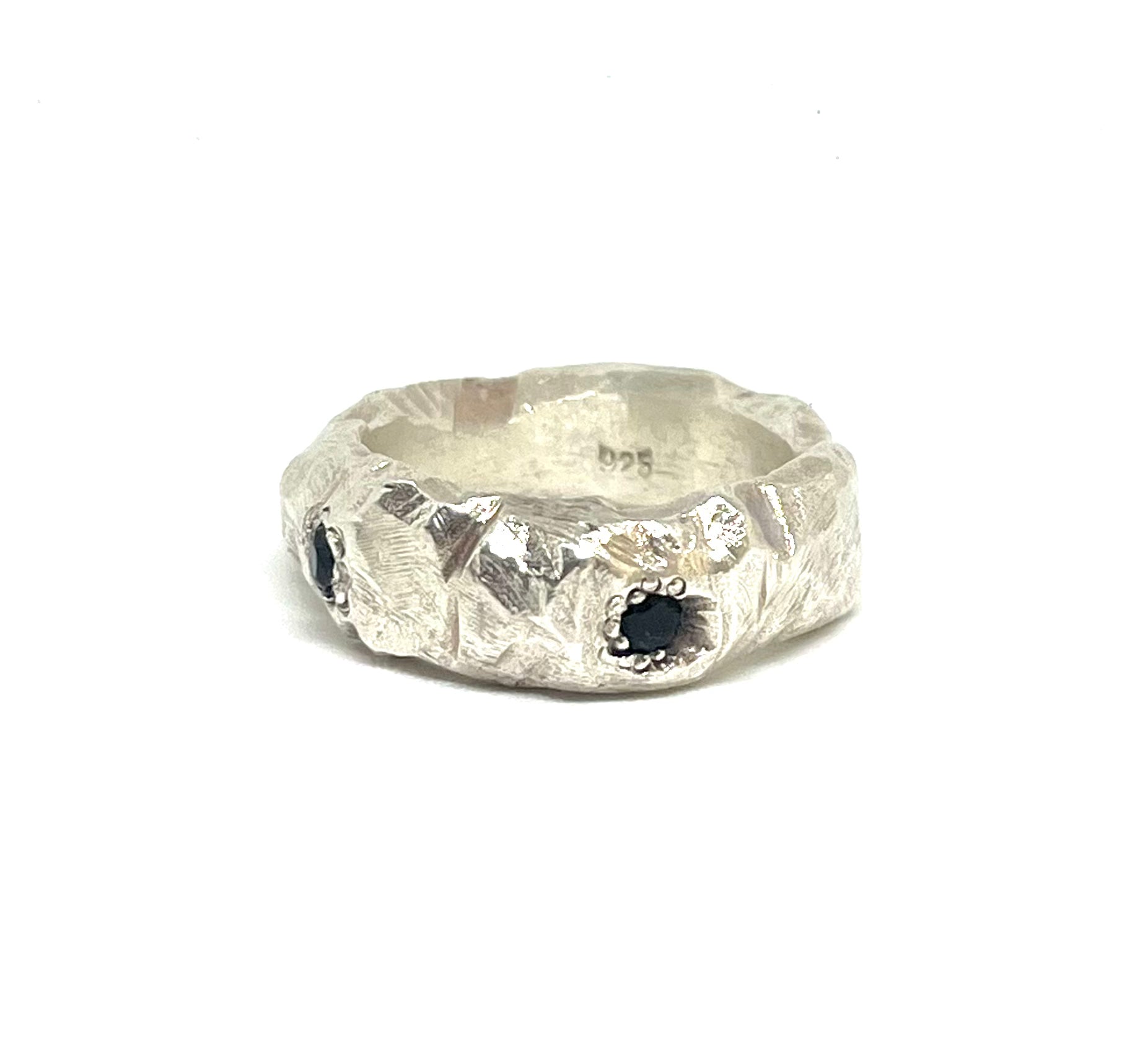 Ring crafted with lost wax method and casted in silver 925. Set with black, deep blue, light blue sapphires, 4 in total.