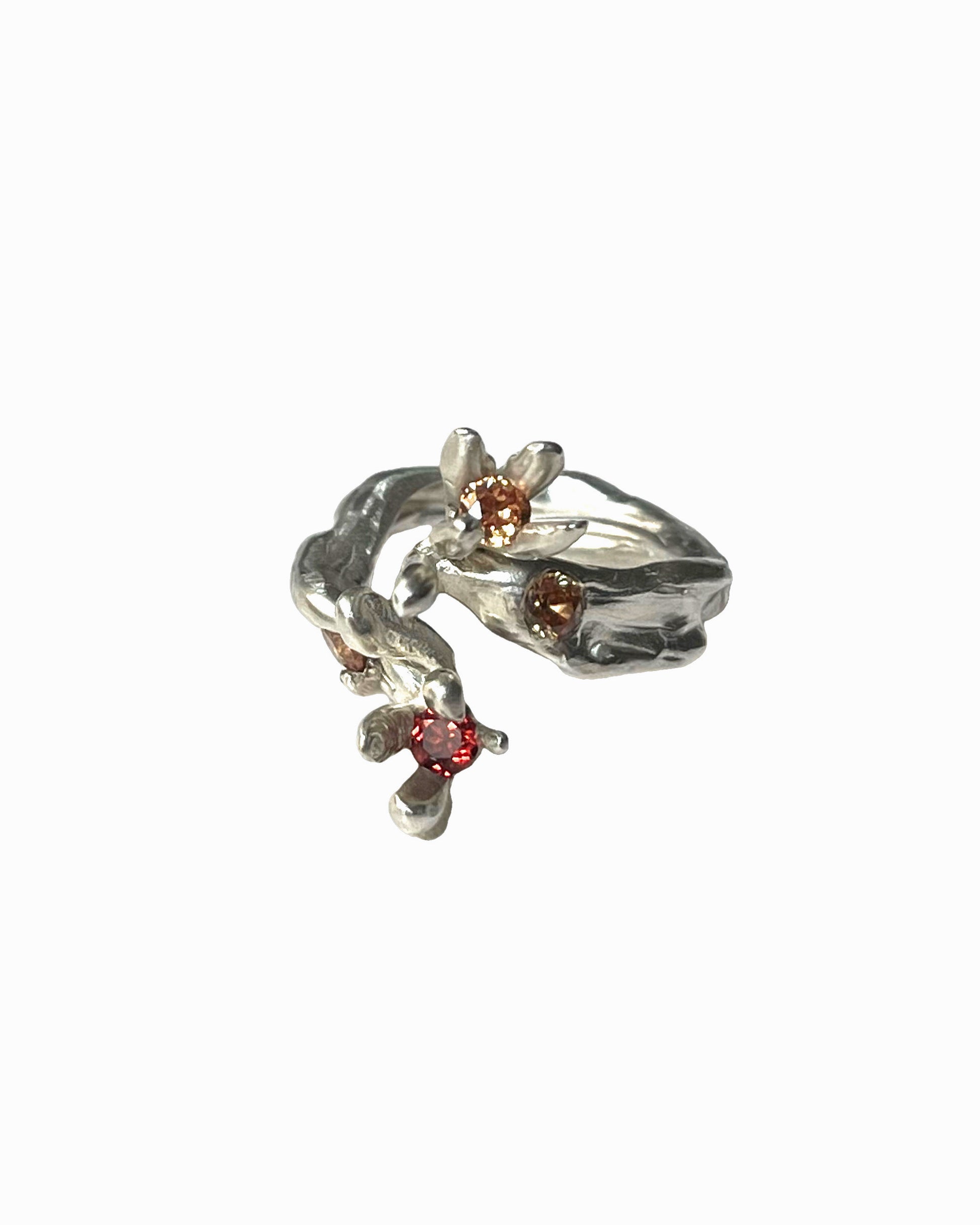 Chrystantemum Ring 02 in version with two little flowers with red garnet surrounded with citrines. Silver 925.