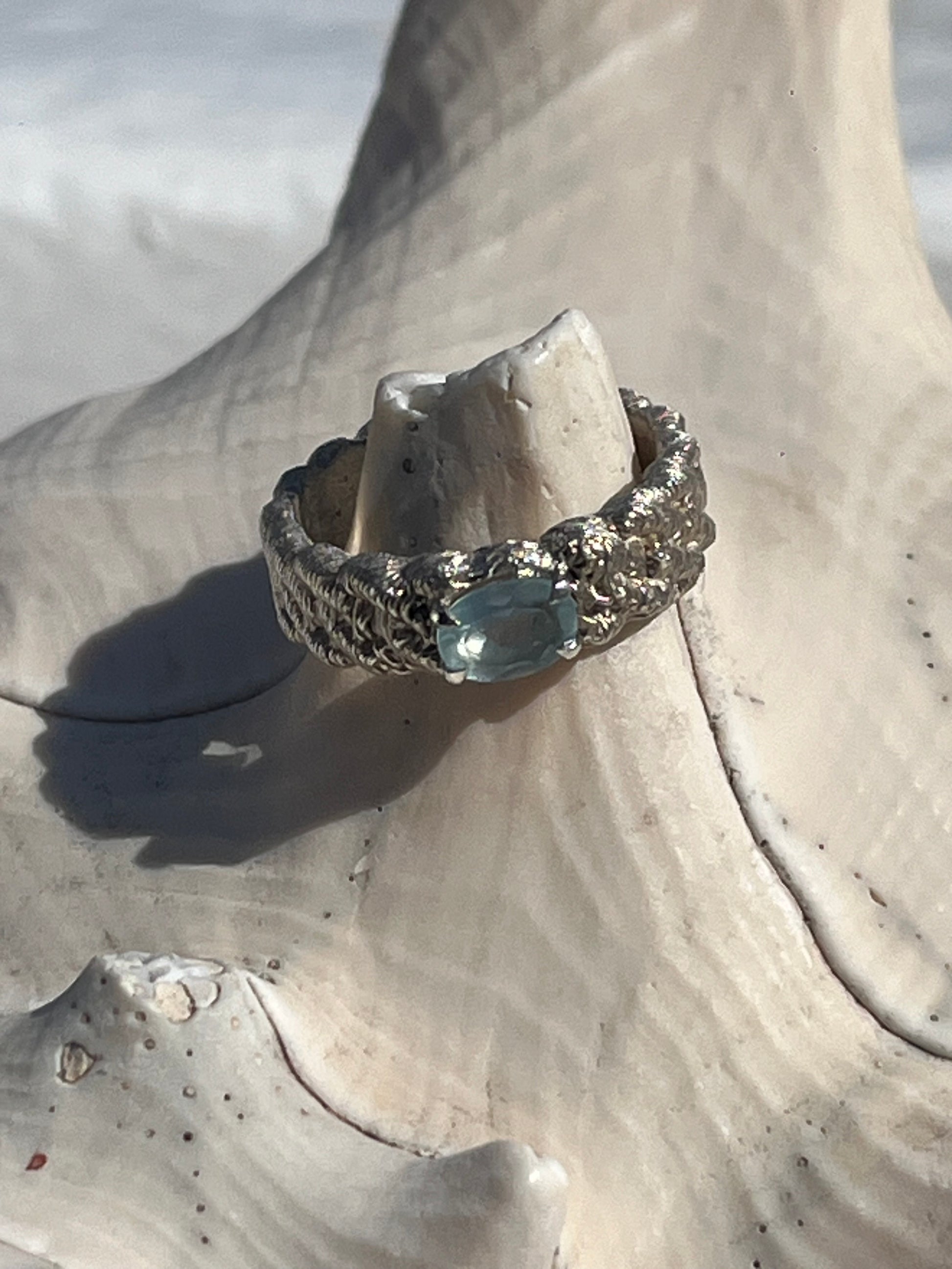 The ring was crafted using a 3D-printed model and cast in silver, featuring an aquamarine stone set using the traditional claw setting method