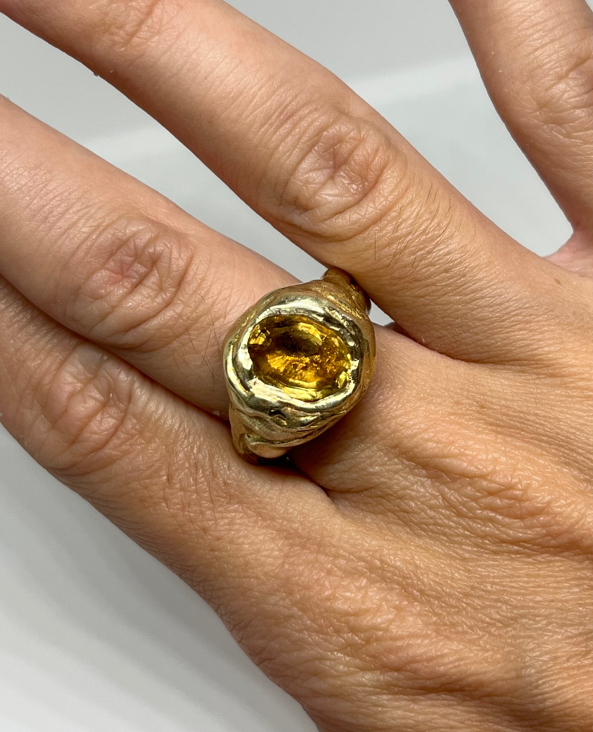 Like a drop of honey kissed by the sun. Ring made in bronze set with gorgeous citrine in art deco cut - gold plated. Size: 53. Unique piece.