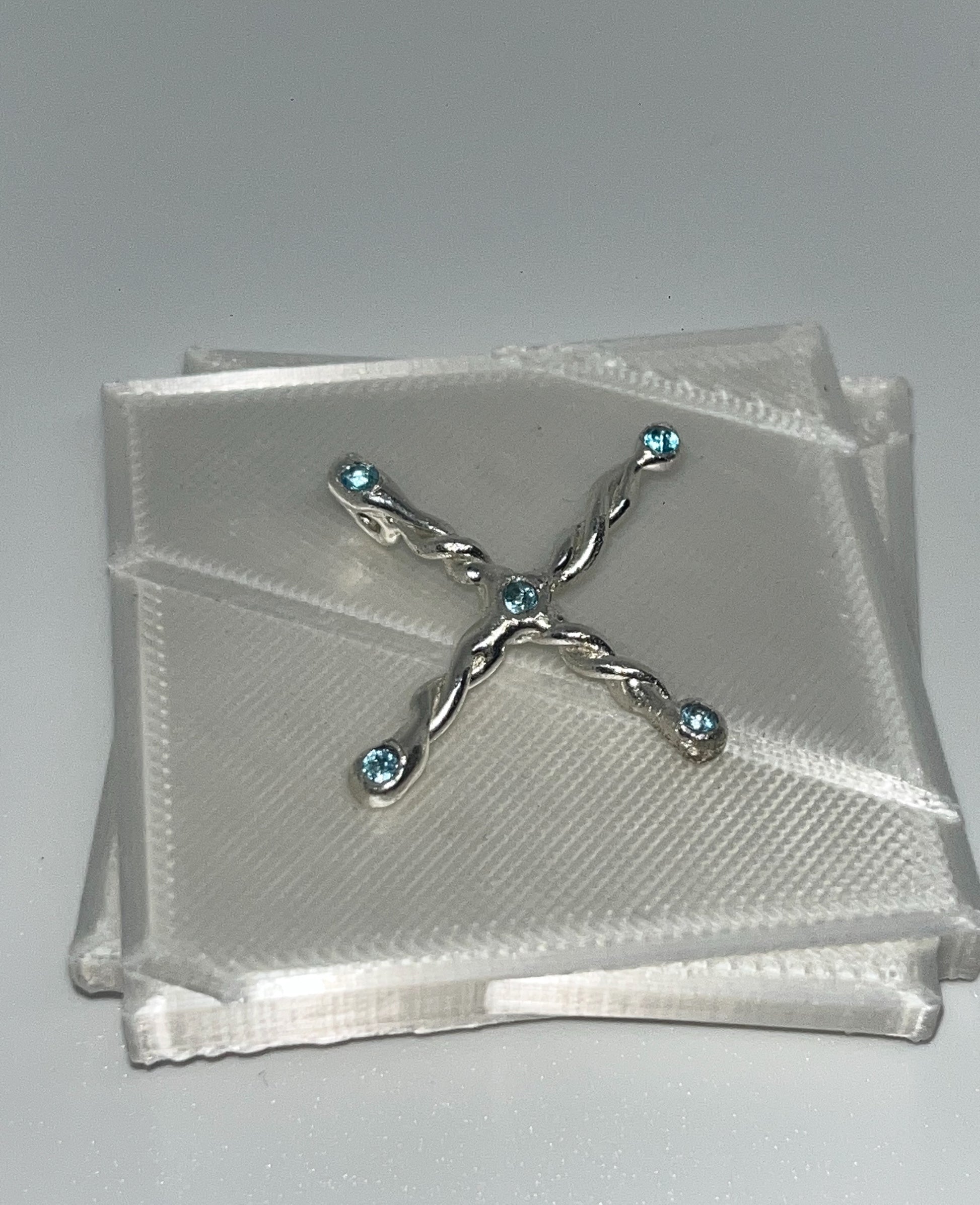 Cross pendant in silver set with 5 blue sky topaz stones.