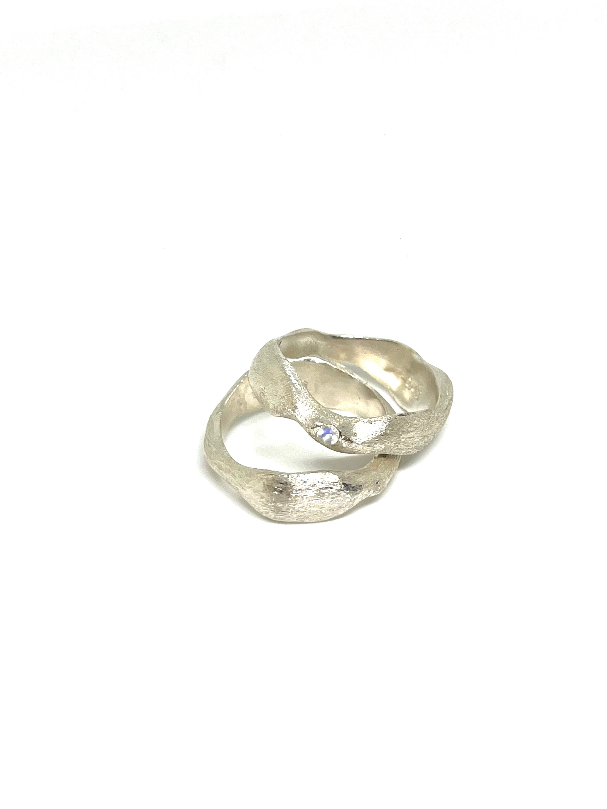 Set of the ring in silver 925 with scratched texture, one of them is set with the moonstone (round cut).